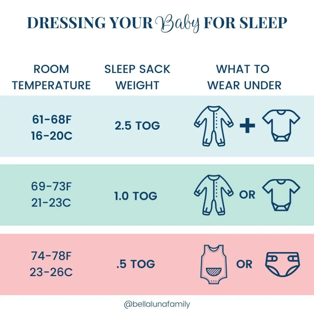 TOG stands for “thermal overall grade” and is essentially the thickness of a sleep sack and how warm it will keep baby. So…what temperature do you keep your home? You want to base the TOG you buy your child off of the temperature of their sleeping environment. Thanks to Family Sleep Institute, we included a picture of their recommended clothing layers and TOG size based on room temperature.